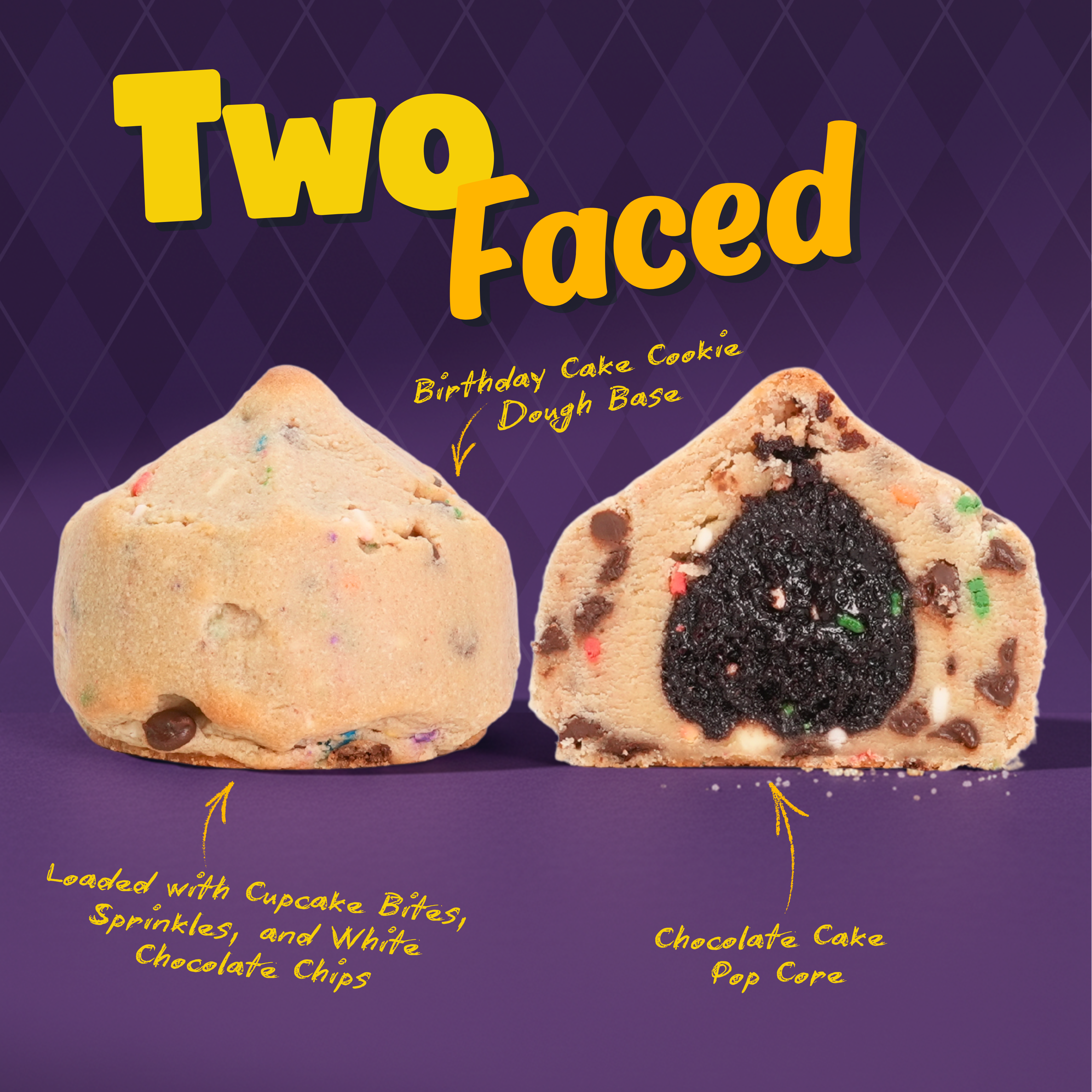 - š Two Faced:Ā A birthday cake cookie loaded with cupcake bites, sprinkles, and white chocolate chips, stuffed with a chocolate cake pop core.
