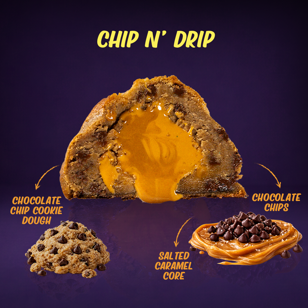 Thicc and salty, just the way we like it. This classic buttery chocolate chip cookie is loaded with caramel bits and hides a rich, gooey salted caramel core that’s ready to ooze its way into your heart. Warm this beauty up, and you’ll understand why it’s called Chip N Drip—decadent, irresistible, and guaranteed to please!