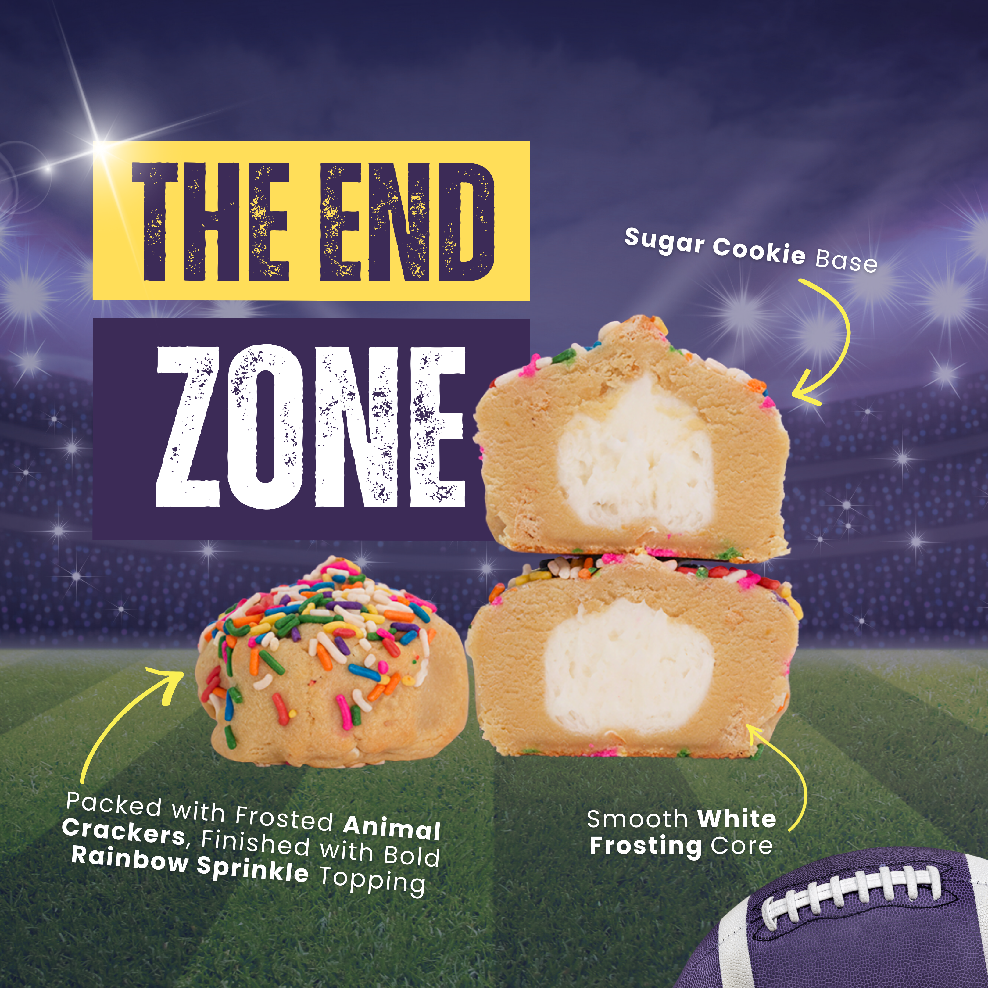 🏆 The End Zone - Every kickoff leads here. Inspired by Super Bowl 2026, where legacy meets next-level energy. It starts with our sugar cookie base, packed with nostalgic frosted animal crackers for that throwback, all-American feel. Inside is a smooth white frosting core, clean and classic, then finished with a bold rainbow sprinkle topping that nods to the Bay’s iconic color moments. Sweet, confident, and built for the biggest stage, this cookie is where the Kickoff pack closes strong.