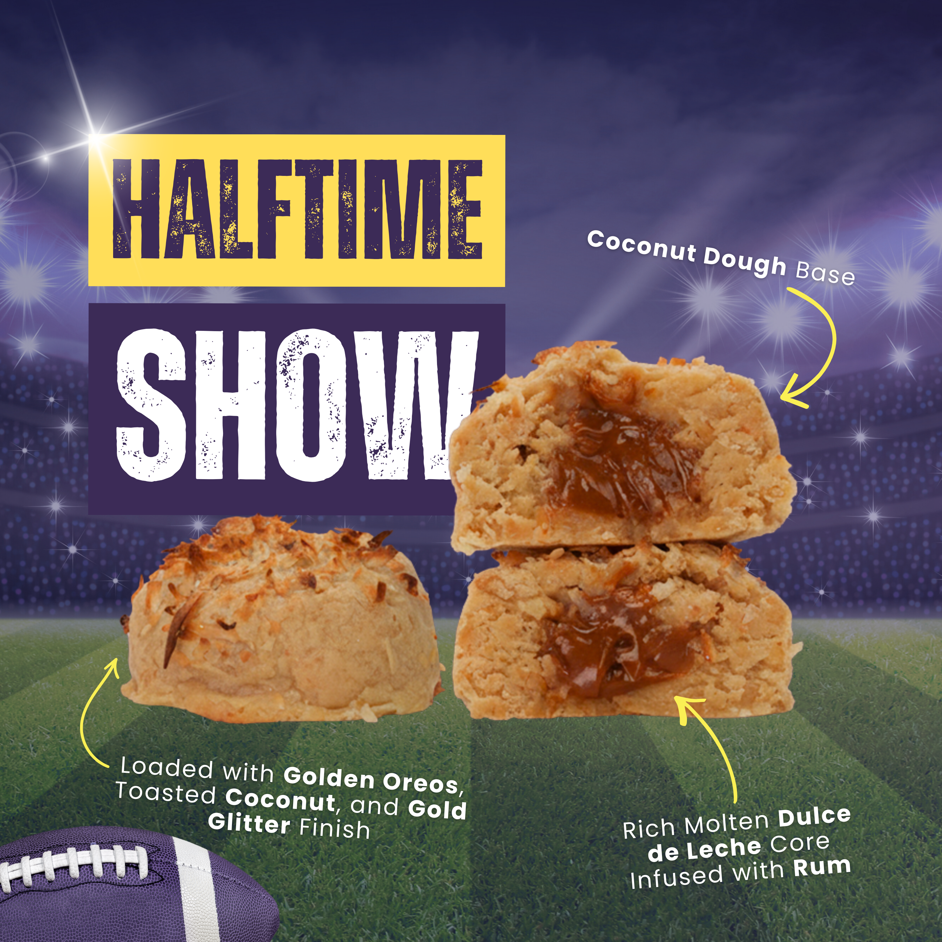 🎶 Halftime Show - Lights down. Volume up. This cookie is stealing the spotlight. Inspired by island heat and halftime-level swag, HalfTime Show starts with our coconut dough, loaded with Golden Oreos and toasted coconut. Inside is a rich, molten dulce de leche core infused with rum that hits right when you least expect it. Finished with toasted coconut and dusted in gold glitter, this cookie performs. Loud, indulgent, and impossible to ignore… just like the halftime show should be.