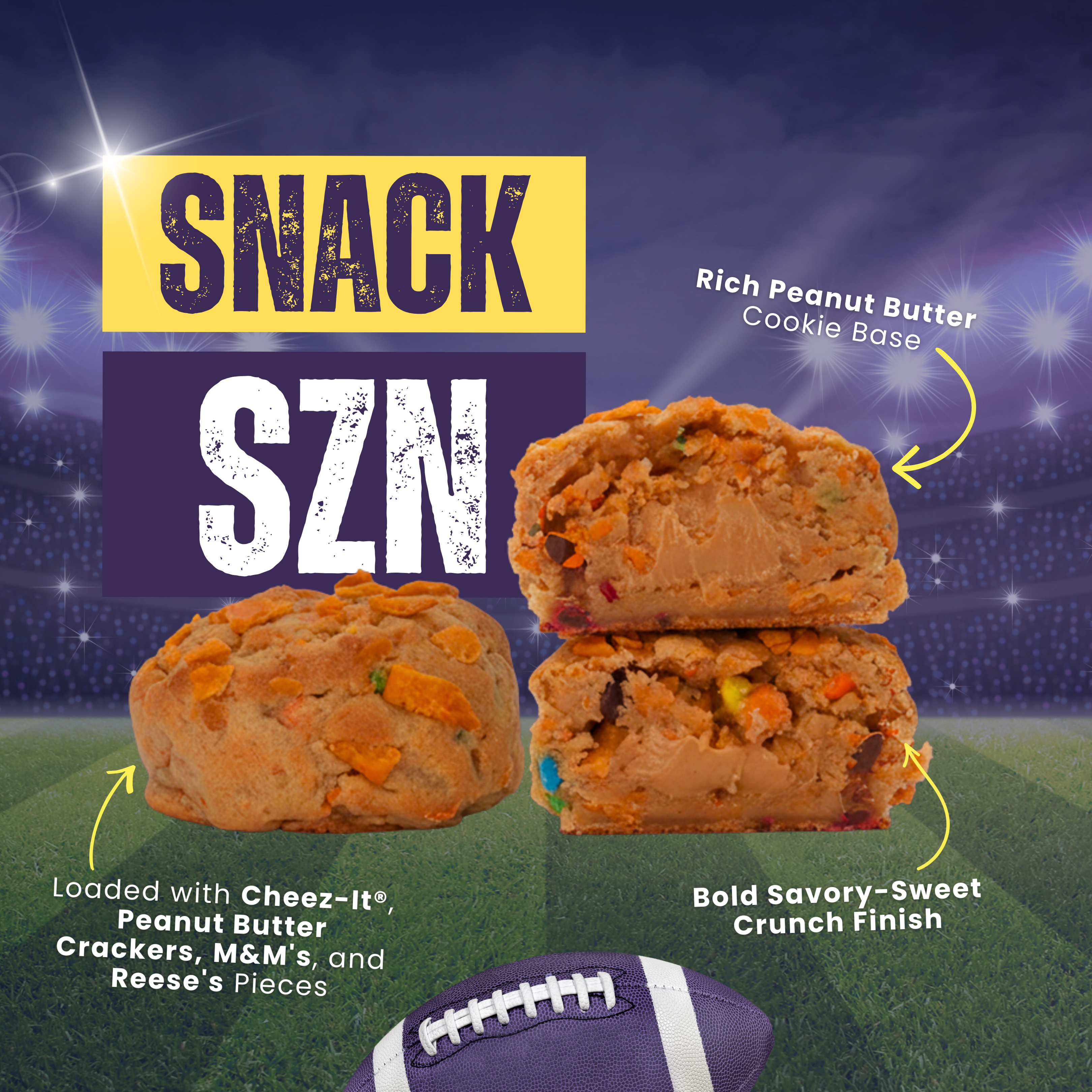🧀 Snack Szn - It’s kickoff weekend, the TV’s loud, the group chat’s buzzing, and the snack table is undefeated. This bold, savory-sweet legend starts with a rich peanut butter cookie base, loaded with salty, crunchy Cheez-It® goodness, peanut butter crackers, M&M's, and Reese's Pieces. It truly delivers a game-changing crunch. This cookie is indulgent, unexpected, and dangerously snackable, because Super Bowl Sunday isn’t the time to play it safe.