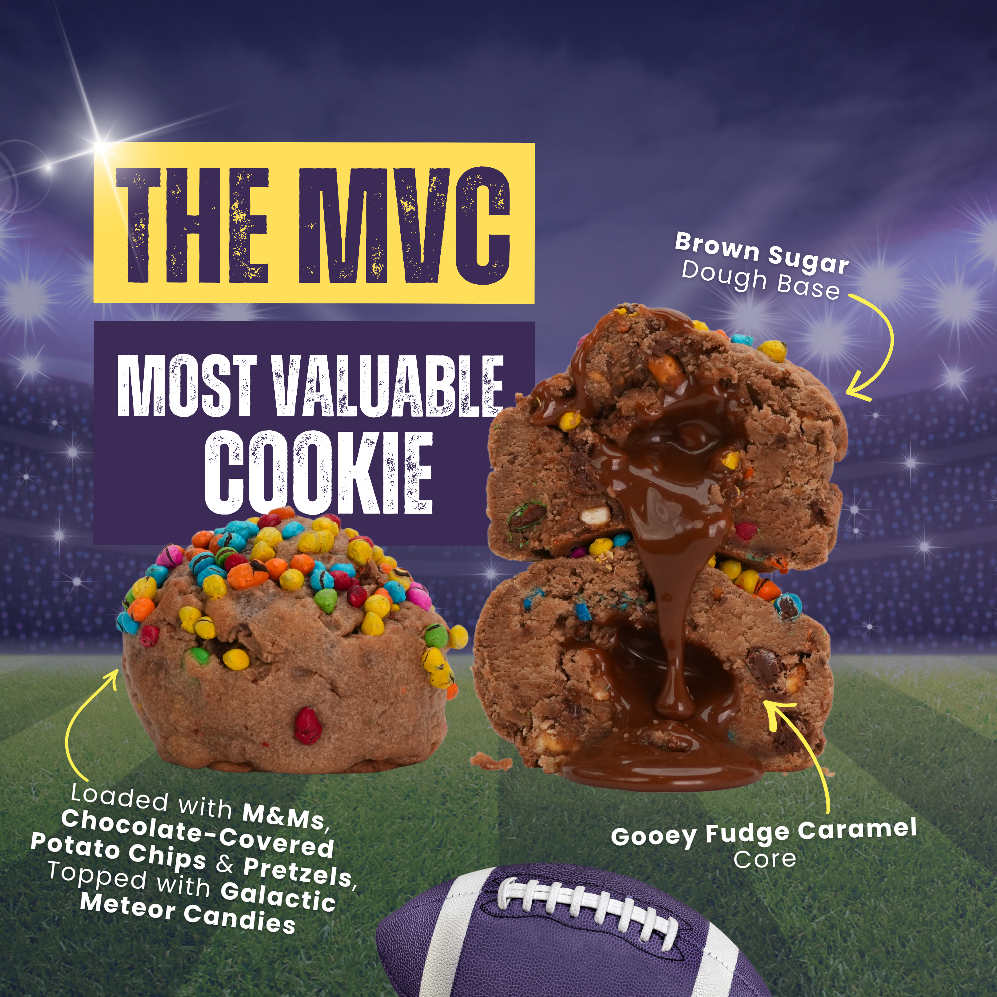 🥨 The MVC (Most Valuable Cookie) - Every game has a standout. The MVC shows up ready to carry the entire snack table on its back. Built on our iconic brown sugar dough, this cookie is absolutely loaded with M&Ms, chocolate-covered potato chips, and chocolate-covered pretzels, all topped with galactic meteor candies. Break it open and you’ll hit a gooey fudge caramel core that seals the deal. Sweet, salty, crunchy, and completely over-the-top, this cookie that wins the game.