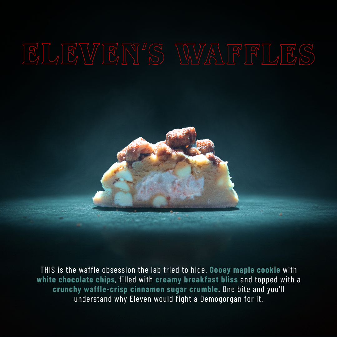 - Eleven’s Waffles –THIS is the waffle obsession the lab didn’t want you to know about. Gooey maple cookie, sweet white chocolate chips, stuffed with creamy breakfast bliss, then crowned with a crunchy waffle-crisp cinnamon sugar crumble. One bite and you’ll understand why Eleven would fight a Demogorgon for it… and honestly, same.