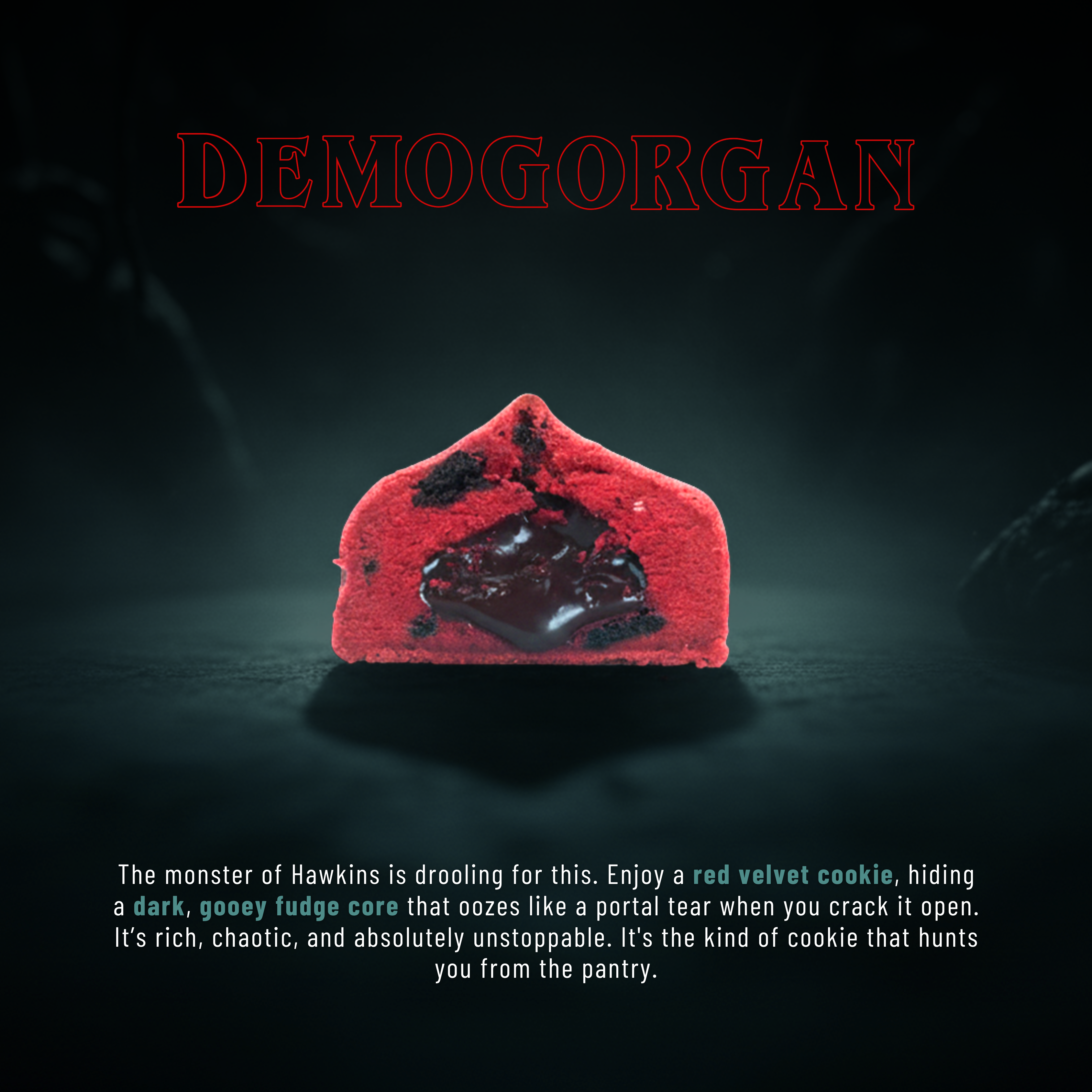 - Demogorgan – The monster of Hawkins is drooling for this. Enjoy a red velvet cookie, hiding a dark, gooey fudge core that oozes like a portal tear when you crack it open. It’s rich, chaotic, and absolutely unstoppable. It's the kind of cookie that haunts you from the pantry.