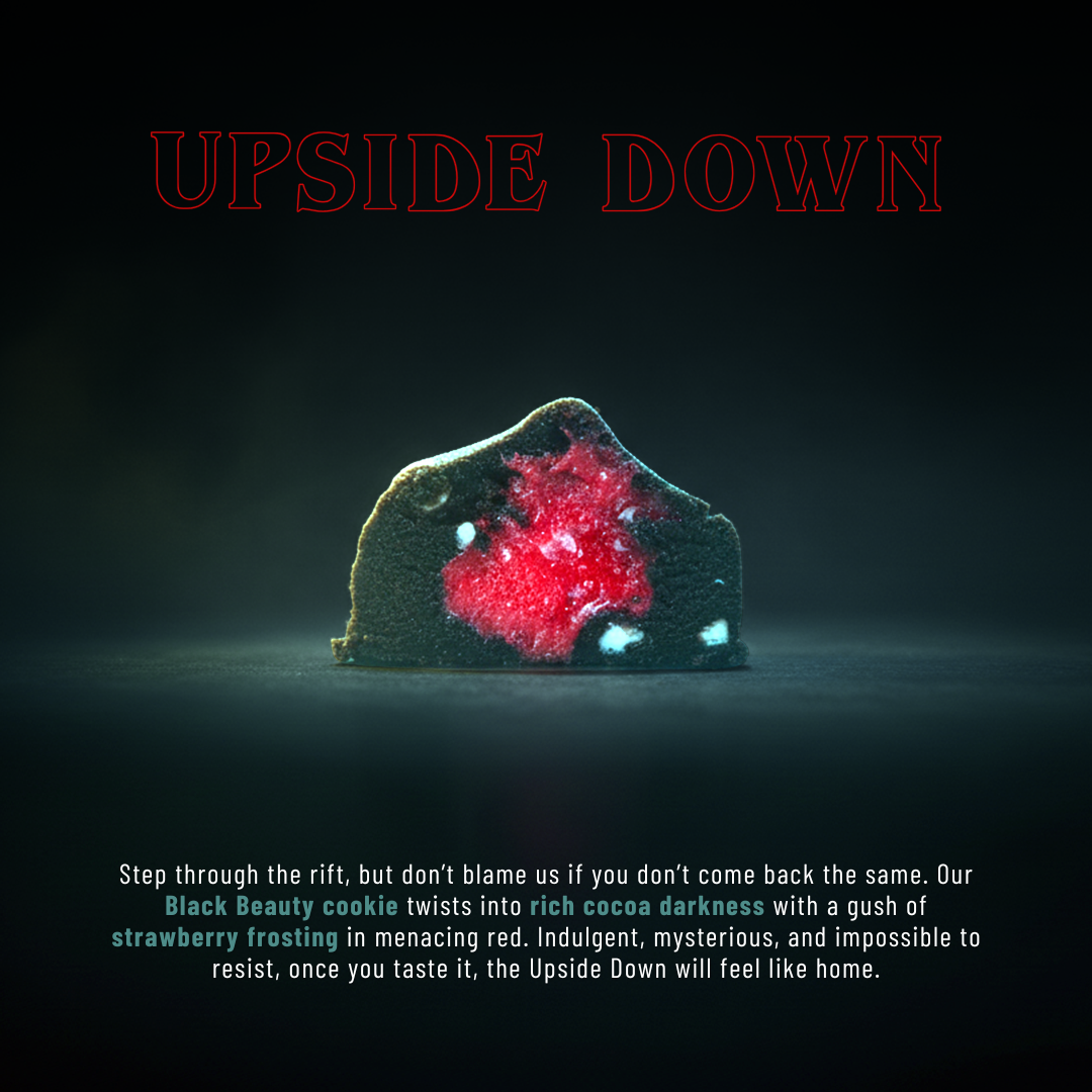 - Upside Down – Step through the rift, but don’t blame us if you don’t come back the same. This eerie twist on our beloved Black Beauty cookie pulls you into a dimension where rich cocoa darkness meets a portal of sweet danger — a gush of strawberry frosting disguised in menacing red. It’s indulgent, mysterious, and impossible to escape… because once you taste it, you’ll want to live in the Upside Down forever.