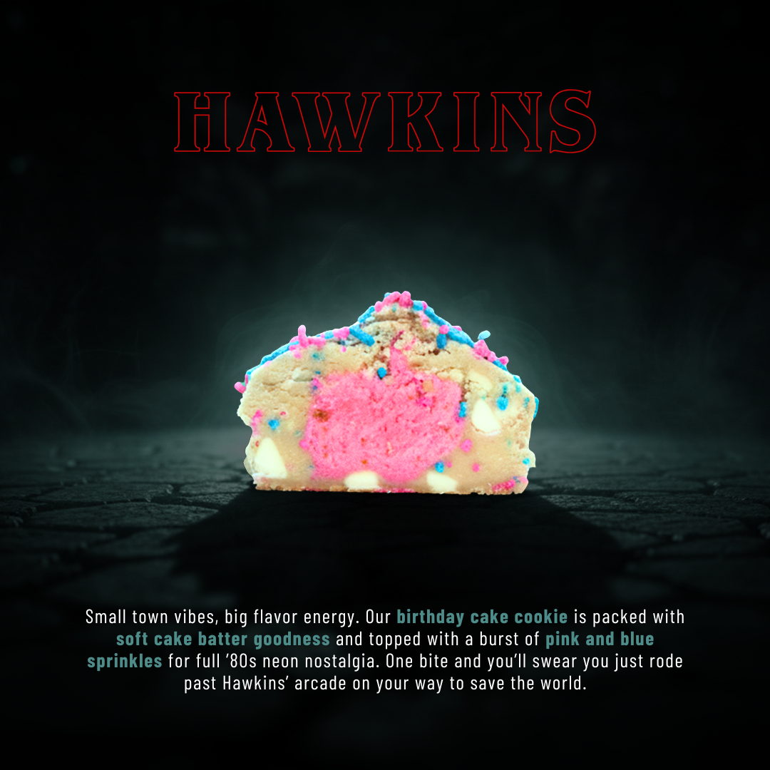 - Hawkins – Small town vibes, big flavor energy. This cookie feels like cruising past the Hawkin’s arcade, windows down, synth music blasting. A birthday cake flavored cookie, packed with soft cake batter goodness and loaded up top with an explosion of pink and blue sprinkles for that full-blown ’80s neon moment, Hawkins is sweet nostalgia disguised as dessert. One bite and you’ll swear you just rode your bike past The Party on their way to save the world.